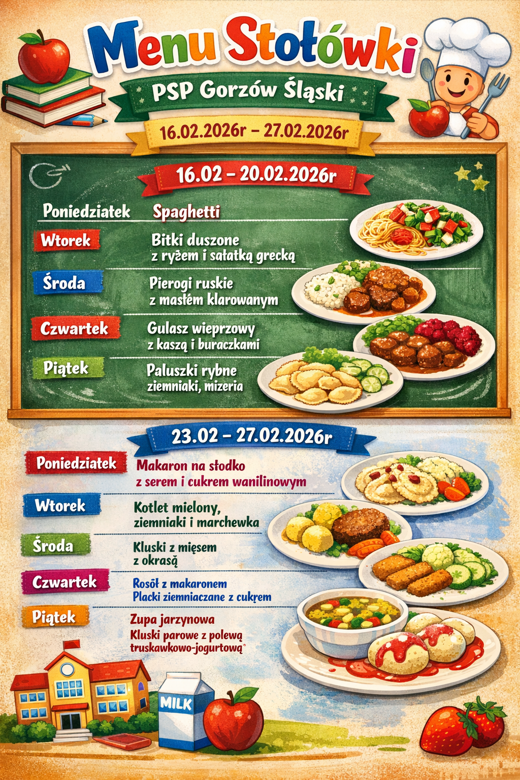 Data publikacji: 2026-02-16 08:30:03 Menu stołówki szkolnej na okres 16.02.2026r-27.02.2026r menu ChatGPT Image 16 lut 2026, 08_29_12