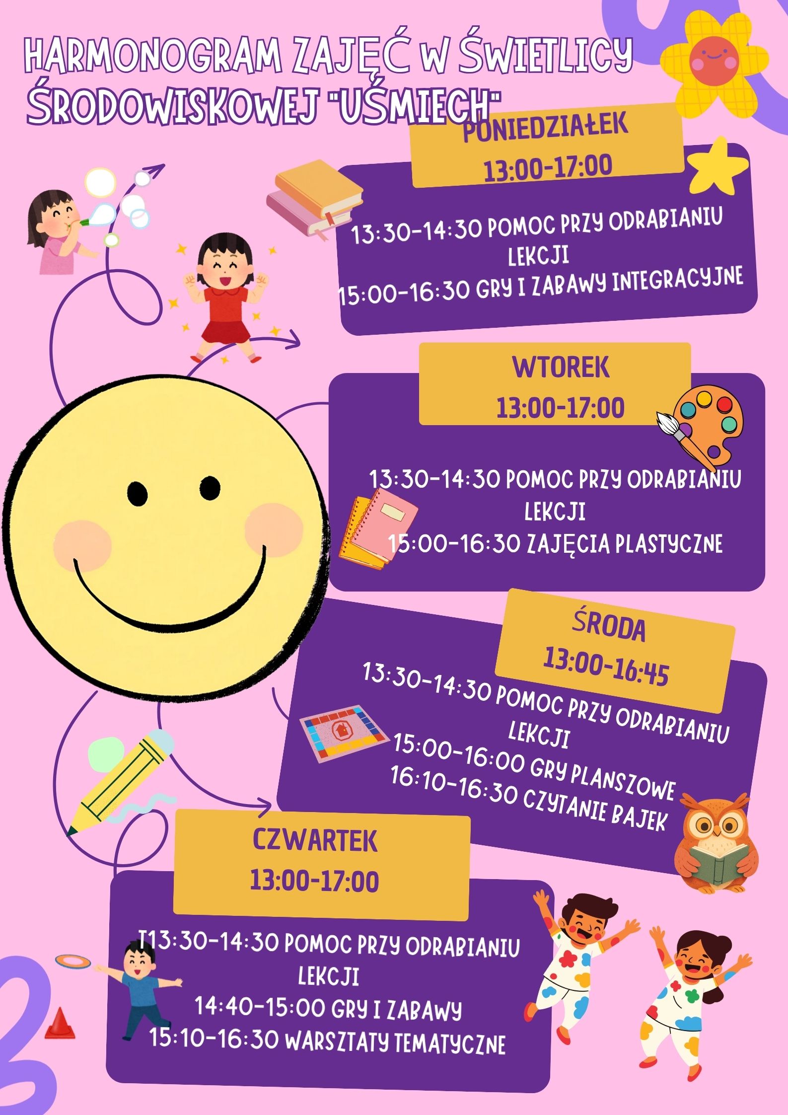Świetlica zapewnia dzieciom bezpieczne warunki do spędzania czasu po zajęciach szkolnych oraz wsparcie w zakresie opieki i wychowania. W ramach prowadzonych działań oferujemy m.in. pomoc w odrabianiu lekcji, zajęcia plastyczne i kreatywne, gry i zabawy integracyjne oraz zajęcia rozwijające zainteresowania.